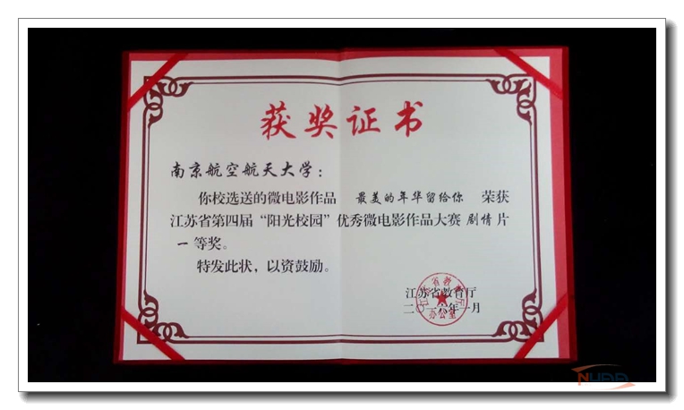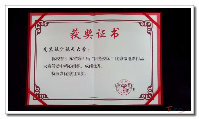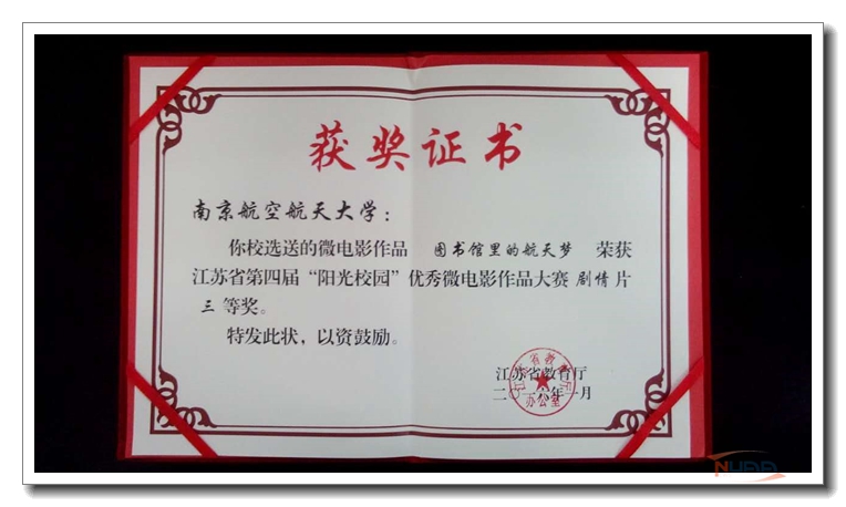 日前,我校多部影像作品获表彰。航天学院摄制的《一分钟航天》获2015中国科教影视“科蕾奖”提名奖。两个作品获江苏省第四届“阳光校园”优秀微电影作品大赛奖项:航空宇航学院徐亮等同学摄制的《最美的年华留给你》获得剧情类一等奖;艺术学院崔新宇、蔺琳、徐月瑶等同学摄制的《图书馆里的航天梦》获得剧情类三等奖。赵毅获优秀指导教师奖,学校获优秀组织奖。