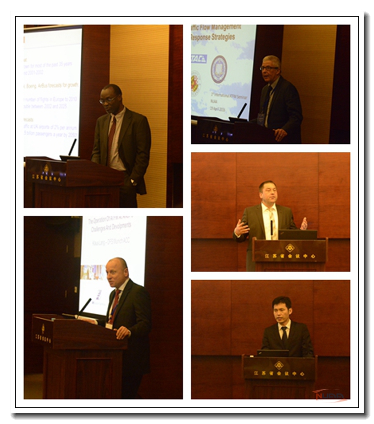 南京航空航天大学国际合作交流处处长金泉元主持了会议开幕式。南京航空航天大学校长聂宏教授、国际民航组织亚太地区分办事处ATM高级官员刘松、中国民航局空管局运行总监马兵、国家空管委办公室主任助理杜强出席会议开幕式并先后致辞。胡明华教授和Achim Eckermann代表组委会致欢迎辞。EUROCONTROL网络经理董事会性能、预测与关系部门主任Brian Flynn专家就世界空中交通流量管理发展及其向全球化流量管理和ICAO全球空中导航计划过渡的趋势,以及欧洲空中交通流量管理系统—从空中交通流量管理到网络运行作了大会报告,国家空域技术重点实验室陈志杰院士和国家空管飞行流量管理技术重点实验主任胡明华教授分别就我国空管发展面临的挑战与技术研究趋势,中国空中交通流量管理的现状、问题与解决方案进行了深入剖析和探讨。会议还邀请了美国加州大学伯克利分校教授、美国联邦航空局航空运行研究大学联盟(FAA NEXTOR II)主任HANSEN Mark,英国皇家工程院院士、帝国理工学院首席教授OCHIENG Washington,德国慕尼黑区域管制中心流量管理经理助理LANG Klaus,德国国家空管公司机场CDM和全机场管理负责人SINZ Erik等做主旨演讲和专题报告,展示欧美在空中交通流量管理理论研究、应用技术和系统建设方面的最新情况。此外,南京航空航天大学民航学院副教授王艳军还作了管制员行为动力学研究进展的主题报告。围绕研讨会九个专题报告,与会代表进行了充分的研讨和交流。