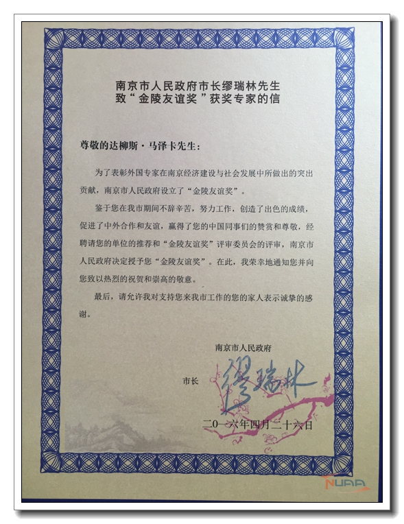 “金陵友谊奖”旨在表彰在南京经济建设和社会事业发展中做出突出贡献的外国专家。2016年度“金陵友谊奖”是2009年首届“金陵友谊奖”启动以来的第四次评选。今年共有包括12位来自企业、高校的外国专家获得此项荣誉。Dalius Mazeika教授是我校第三位获得此殊荣的专家。