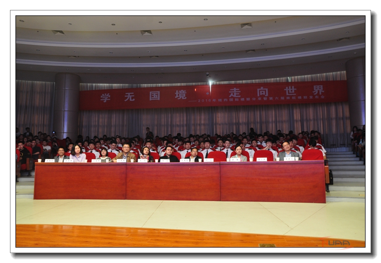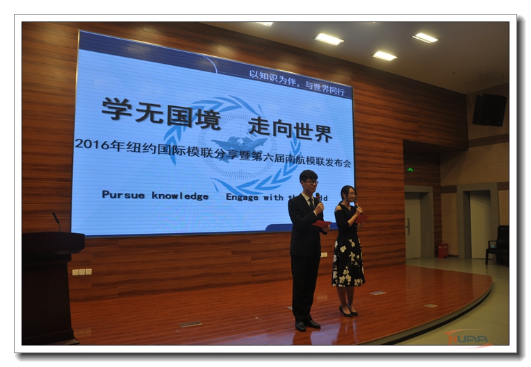 4月21日,主题为“学无国境·走向世界”的2016年纽约国际模联分享暨第六届南航模联发布会在校将军路校区一号楼四楼报告厅举行。校党委宣传部部长石勇、教务处处长王成华、学生处处长王晖、外国语学院院长范祥涛、研工部副部长王亚彤、教务处副处长朱建军、国际交流合作处副处长梁薇、校团委副书记张亚丽、国际教育学院副院长张国权、外国语学院党委副书记庞小燕和全场五百多名观众一起与南航模联共同分享了国际化学习并逐步走向世界的历程,研讨了我校以组织开展模拟联合国系列活动为抓手推动人才培养国际化的体会。