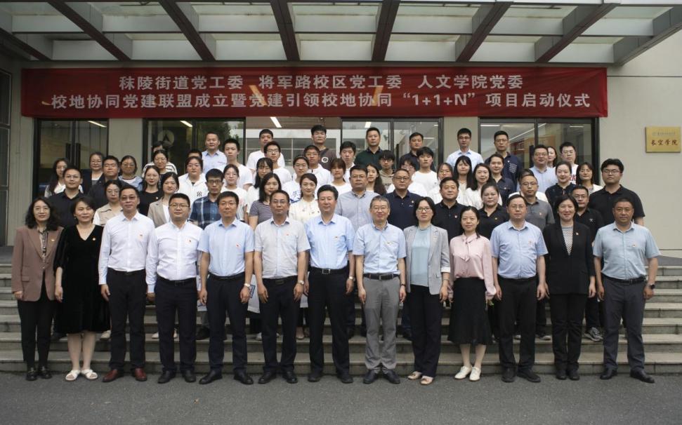 为进一步贯彻落实党的二十大精神,扎实开展学习贯彻习近平新时代中国特色社会主义思想主题教育,5月31日,将军路校区党工委、人文与社会科学学院党委、秣陵街道党工委齐聚我校将军路校区,访校园、组同盟、建基地、聘导师、育新人,在长空学院“润&致”广场正式举行校地协同党建联盟成立暨党建引领校地协同“1+1+N”项目启动仪式。秣陵街道党工委书记程杰恒,街道党工委副书记、政协工委主任王胜华,将军路校区党工委书记邬沛雄,人文与社会科学学院党委书记楚广兴,长空学院常务副院长蒋彦龙,分析测试中心主任王毅等负责同志,街道机关部门相关同志、企业代表、校内师生代表参加仪式。仪式由将军路校区党工委副书记、长空学院副院长张林主持。