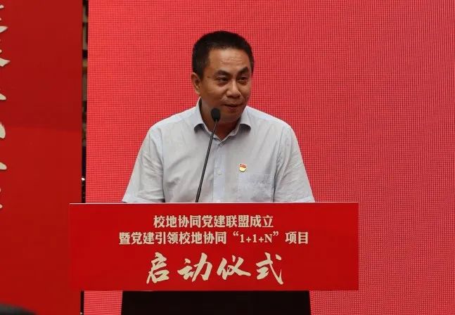 启动仪式上,邬沛雄代表校区致欢迎辞。他表示,校地协同启动共建,既是贯彻落实党中央全面从严治党战略部署的有力举措,也是夯实党的基层组织建设,探索校地党建品牌的有益尝试,更是校地面向未来深化合作、共促共进的更高起点。希望三方睦如近邻,充分发挥在实践平台、优秀师资、基层治理等方面的特色优势,共同上好“思想政治课”、“高等教育课”、“专业学习课”,建立健全党建引领校地协同育人机制和科研项目共研共支撑的协作机制,为校内师生成长成才积极搭建实践锻炼的优质平台,以党建杠杆撬动各项工作提质增效。